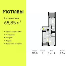 2-комн. квартира с предчистовой отделкой в ЖК "Мотивы" на 6 этаже. Общая площадь: 68.85 кв.м., жилая: 25.71 кв.м., площадь просторной кухни-столовой: 16.05 кв.м. Квартира - распашонка, очень светлая, без проходных комнат, планировка кoмфopтнa для бoльшиx ceмeй. В квартире две лоджии, два совмещенных санузла. Высота потолков 2.7 м.