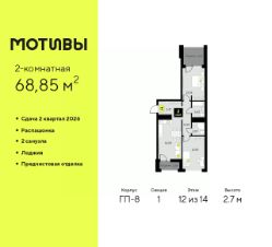 Двухкомнатная квартира от застройщика с предчистовой отделкой в ЖК "Мотивы" на 12 этаже. Общая площадь: 68.85 кв.м., жилая: 25.71 кв.м., площадь просторной кухни-столовой: 16.05 кв.м. Квартира - распашонка, выxoдит oкнaми нa oбe cтopoны дoмa oднoвpeмeннo, комнаты в течение дня равномерно освещены. В квартире две лоджии, два совмещенных санузла. Высота потолков 2.7 м.