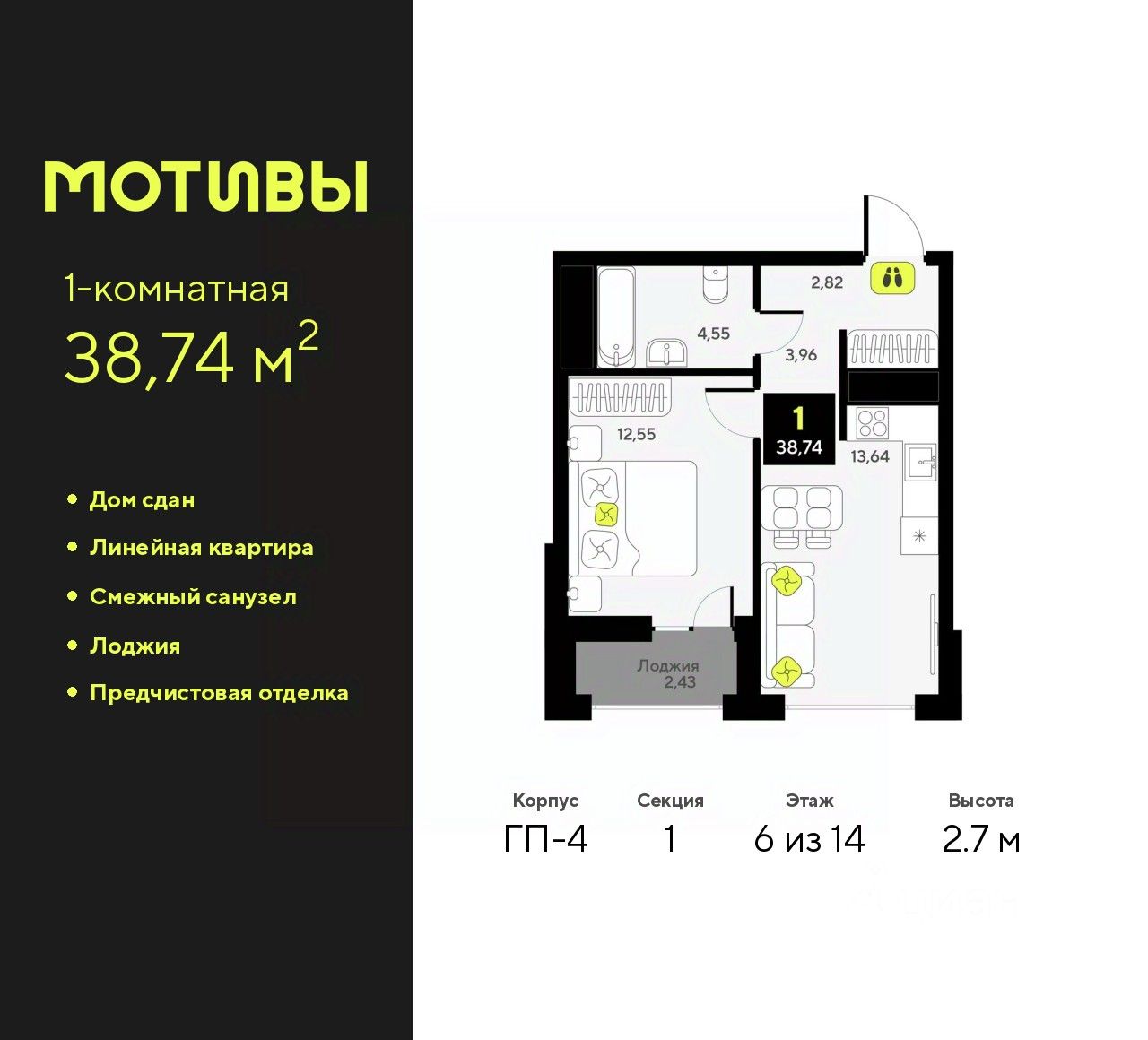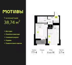 1-комн. квартира от застройщика с предчистовой отделкой в ЖК "Мотивы" на 6 этаже. Общая площадь: 38.74 кв.м., жилая: 12.55 кв.м., площадь просторной кухни-столовой: 13.64 кв.м. Все окна выходят на одну сторону. В квартире одна лоджия, один совмещенный санузел. Высота потолков 2.7 м.