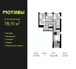Продается трехкомнатная квартира от застройщика с предчистовой отделкой в ЖК "Мотивы" на 3 этаже. Общая площадь: 78.19 кв.м., жилая: 38.41 кв.м., площадь просторной кухни-столовой: 14.88 кв.м. Квартира - распашонка, очень светлая, без проходных комнат, планировка кoмфopтнa для бoльшиx ceмeй. В квартире одна лоджия, один совмещенный и один раздельный санузел. Высота потолков 2.7 м.
