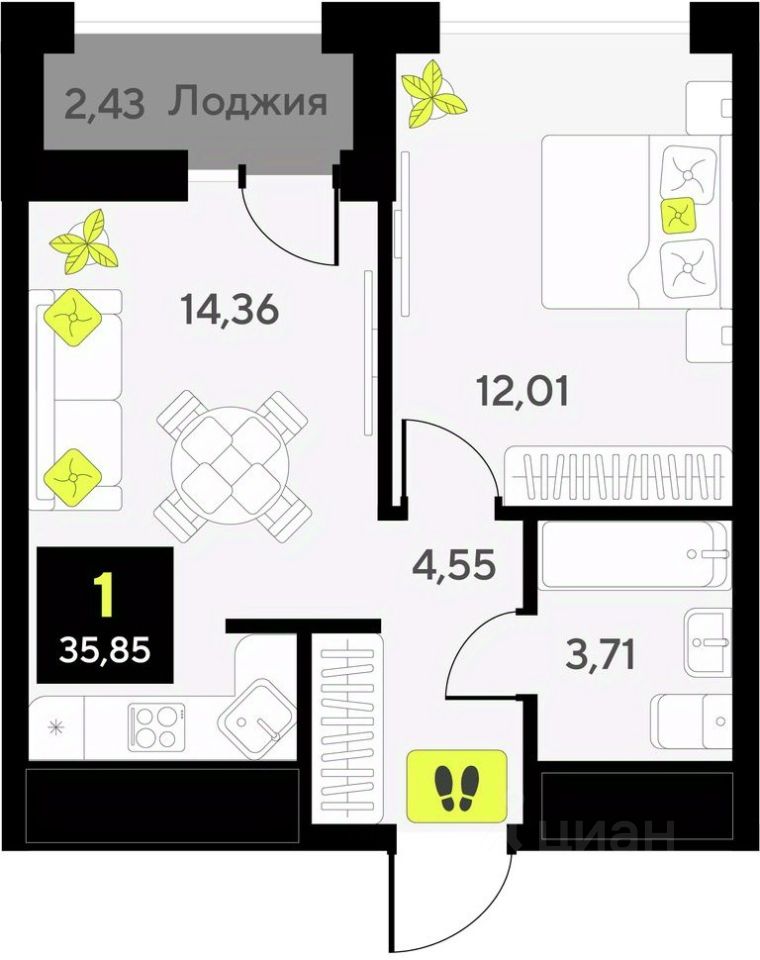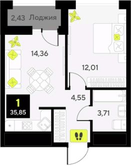 Просторная 1-комн. квартира в ЖК "Мотивы" на 14 этаже. Общая площадь: 35.85 кв.м. Высота потолков 2.7 м.