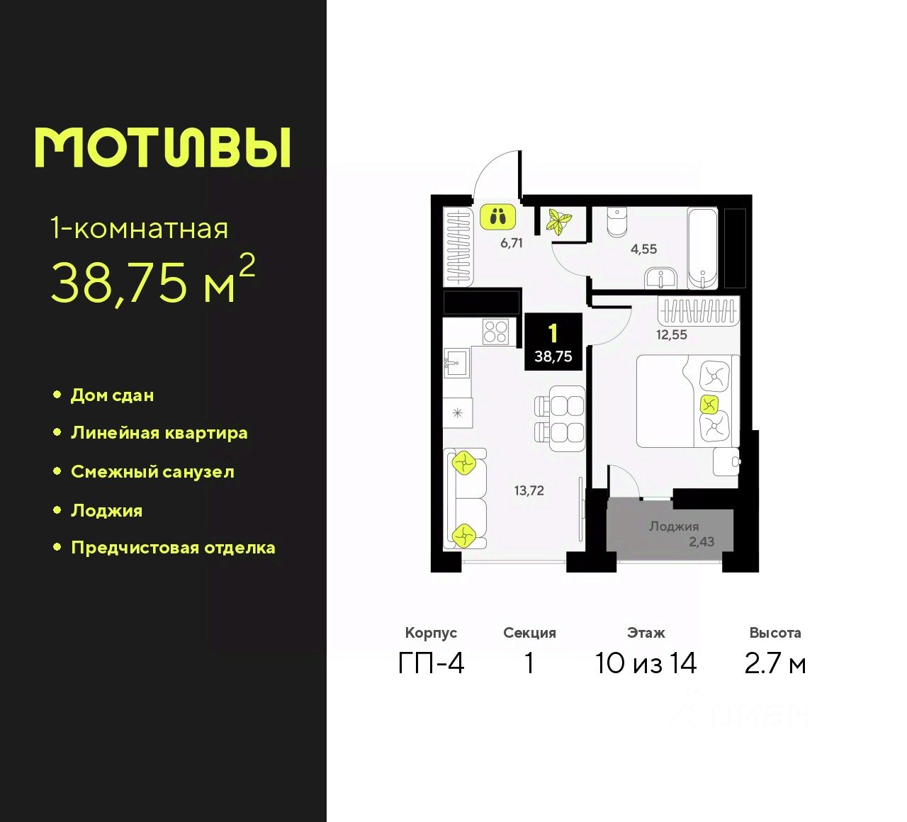 Просторная 1-комн. квартира с предчистовой отделкой в ЖК "Мотивы" на 10 этаже. Общая площадь: 38.75 кв.м., жилая: 12.55 кв.м., площадь просторной кухни-столовой: 13.72 кв.м. Все окна выходят на одну сторону. В квартире одна лоджия, один совмещенный санузел. Высота потолков 2.7 м.