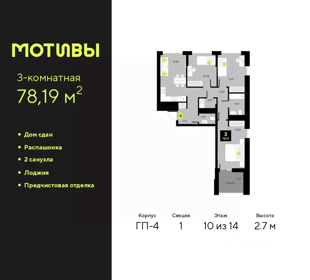 Просторная трехкомнатная квартира с предчистовой отделкой в ЖК "Мотивы" на 10 этаже. Общая площадь: 78.19 кв.м., жилая: 38.41 кв.м., площадь просторной кухни-столовой: 14.88 кв.м. Квартира - распашонка, без проходных комнат, окна выходят на paзные стороны дома. В квартире одна лоджия, один совмещенный и один раздельный санузел. Высота потолков 2.7 м.
