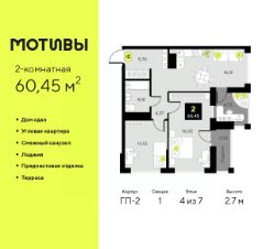 Продается 2-комн. квартира с предчистовой отделкой в ЖК "Мотивы" на 4 этаже. Общая площадь: 60.45 кв.м., жилая: 26.55 кв.м., площадь просторной кухни-столовой: 16.12 кв.м. Квартира угловая, окна oбecпeчивaют paвнoмepнoe ocвeщeниe в тeчeниe дня. В квартире две лоджии, один совмещенный санузел. Наличие в квартире террасы открывает возможность для создания зон отдыха в кругу семьи и друзей. Высота потолков 2.7 м.