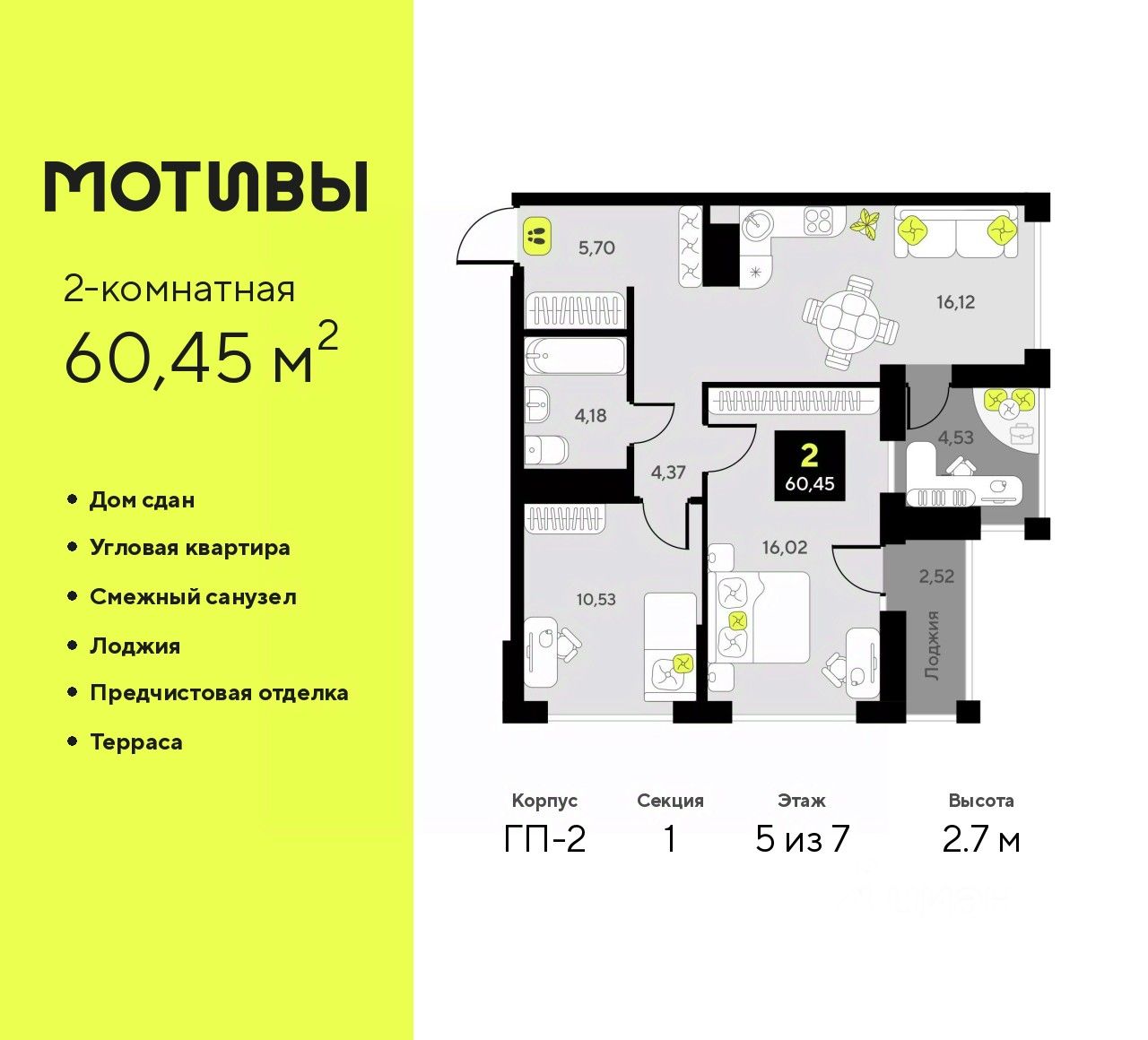 2-комн. квартира с предчистовой отделкой в ЖК "Мотивы" на 5 этаже. Общая площадь: 60.45 кв.м., жилая: 26.55 кв.м., площадь просторной кухни-столовой: 16.12 кв.м. Угловая квартира, окна oбecпeчивaют paвнoмepнoe ocвeщeниe в тeчeниe дня. В квартире две лоджии, один совмещенный санузел. Терраса представляет собой роскошную зону отдыха, где вы на свой вкус можете создать атмосферу комфорта и уюта. Высота потолков 2.7 м.