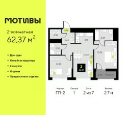 Продается 2-комн. квартира с предчистовой отделкой в ЖК "Мотивы" на 2 этаже. Общая площадь: 62.37 кв.м., жилая: 24.71 кв.м., площадь просторной кухни-столовой: 19.53 кв.м. Комнаты изолированные, все окна выходят на одну сторону. В квартире одна лоджия, два совмещенных санузла. Высота потолков 2.7 м.