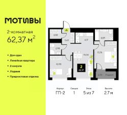 Просторная двухкомнатная квартира с предчистовой отделкой в ЖК "Мотивы" на 5 этаже. Общая площадь: 62.37 кв.м., жилая: 24.71 кв.м., площадь просторной кухни-столовой: 19.53 кв.м. Комнаты изолированные, все окна выходят на одну сторону. В квартире одна лоджия, два совмещенных санузла. Высота потолков 2.7 м.