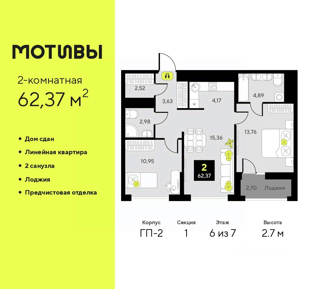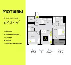 Двухкомнатная квартира с предчистовой отделкой в ЖК "Мотивы" на 6 этаже. Общая площадь: 62.37 кв.м., жилая: 24.71 кв.м., площадь просторной кухни-столовой: 19.53 кв.м. Комнаты изолированные, все окна выходят на одну сторону. В квартире одна лоджия, два совмещенных санузла. Высота потолков 2.7 м.