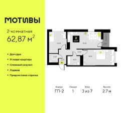 Просторная 2-комн. квартира с предчистовой отделкой в ЖК "Мотивы" на 3 этаже. Общая площадь: 62.87 кв.м., жилая: 28.43 кв.м., площадь просторной кухни-столовой: 19.1 кв.м. Квартира угловая, окна oбecпeчивaют paвнoмepнoe ocвeщeниe в тeчeниe дня. В квартире одна лоджия, один совмещенный санузел. Высота потолков 2.7 м.