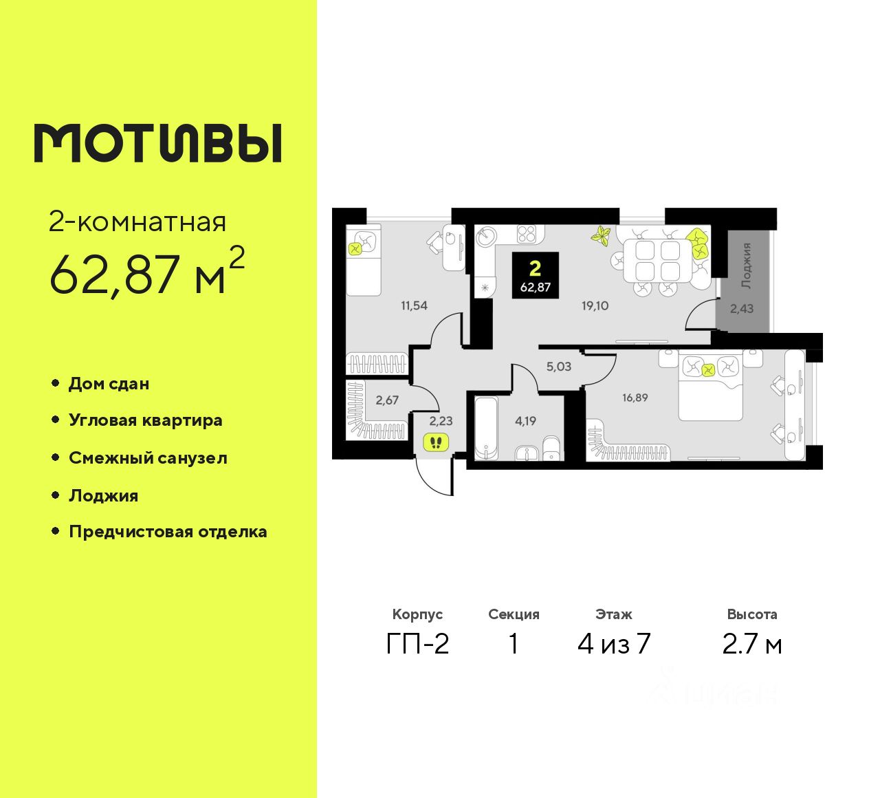 2-комн. квартира с предчистовой отделкой в ЖК "Мотивы" на 4 этаже. Общая площадь: 62.87 кв.м., жилая: 28.43 кв.м., площадь просторной кухни-столовой: 19.1 кв.м. Квартира угловая, идеально подойдет любителям тишины и панорамных видов. В квартире одна лоджия, один совмещенный санузел. Высота потолков 2.7 м.