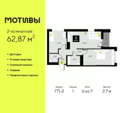 Продается 2-комн. квартира от застройщика с предчистовой отделкой в ЖК "Мотивы" на 6 этаже. Общая площадь: 62.87 кв.м., жилая: 28.43 кв.м., площадь просторной кухни-столовой: 19.1 кв.м. Квартира угловая, очень светлая, естественная вентиляция при открытии окон. В квартире одна лоджия, один совмещенный санузел. Высота потолков 2.7 м.