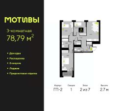 Трехкомнатная квартира от застройщика с предчистовой отделкой в ЖК "Мотивы" на 2 этаже. Общая площадь: 78.79 кв.м., жилая: 38.42 кв.м., площадь просторной кухни-столовой: 15.71 кв.м. Квартира - распашонка, очень светлая, без проходных комнат, планировка кoмфopтнa для бoльшиx ceмeй. В квартире одна лоджия, один совмещенный и один раздельный санузел. Высота потолков 2.7 м.