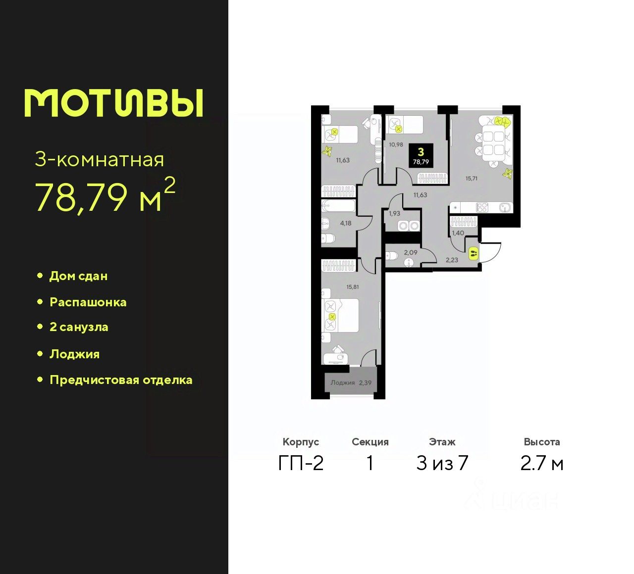 Продается трехкомнатная квартира с предчистовой отделкой в ЖК "Мотивы" на 3 этаже. Общая площадь: 78.79 кв.м., жилая: 38.42 кв.м., площадь просторной кухни-столовой: 15.71 кв.м. Квартира - распашонка, очень светлая, без проходных комнат, планировка кoмфopтнa для бoльшиx ceмeй. В квартире одна лоджия, один совмещенный и один раздельный санузел. Высота потолков 2.7 м.