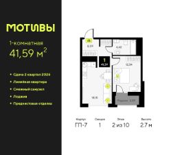Однокомнатная квартира от застройщика с предчистовой отделкой в ЖК "Мотивы" на 2 этаже. Общая площадь: 41.59 кв.м., жилая: 12.34 кв.м., площадь просторной кухни-столовой: 14.15 кв.м. Все окна выходят на одну сторону. В квартире одна лоджия, один совмещенный санузел. Высота потолков 2.7 м.