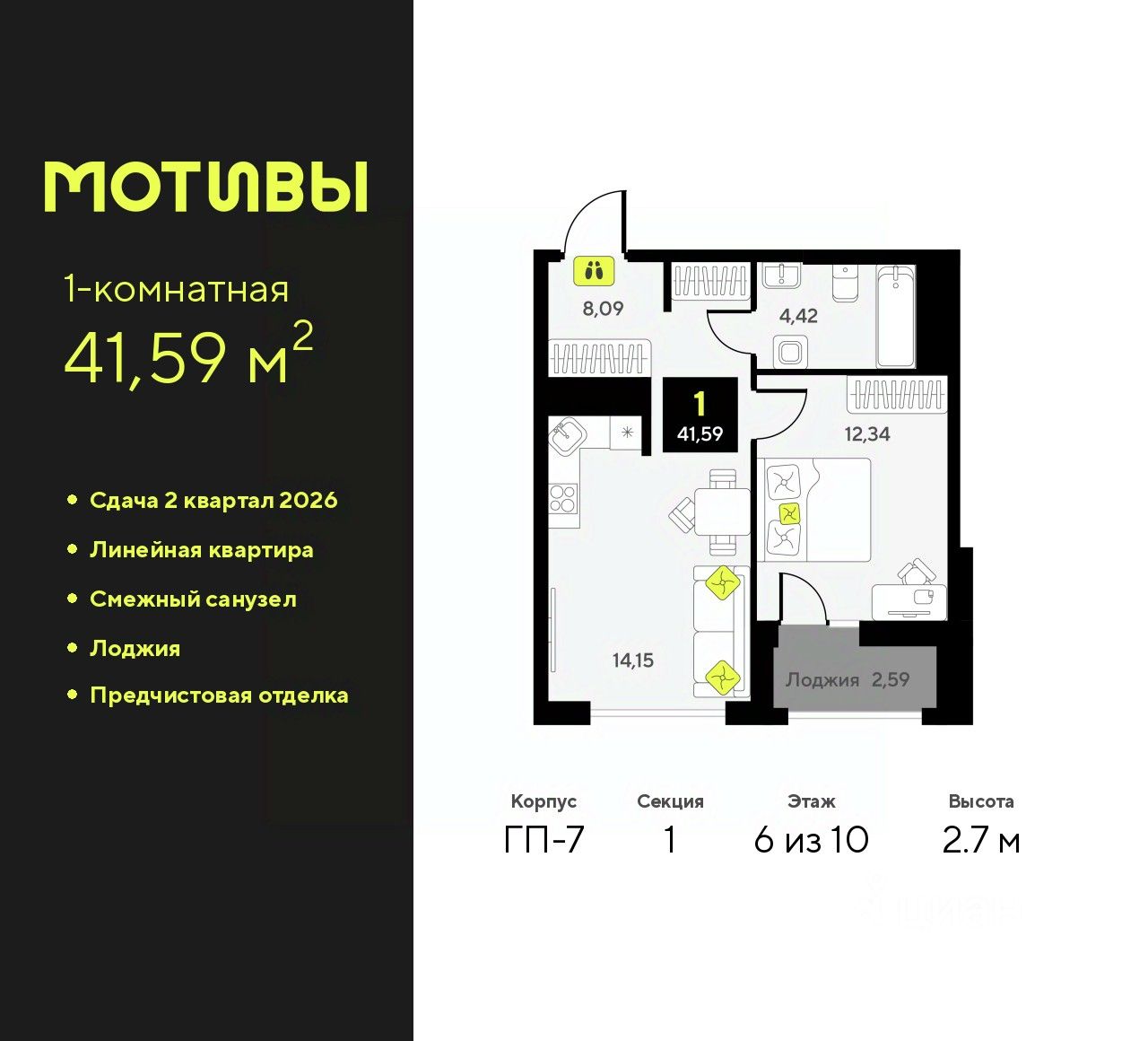 Просторная 1-комн. квартира с предчистовой отделкой в ЖК "Мотивы" на 6 этаже. Общая площадь: 41.59 кв.м., жилая: 12.34 кв.м., площадь просторной кухни-столовой: 14.15 кв.м. Все окна выходят на одну сторону. В квартире одна лоджия, один совмещенный санузел. Высота потолков 2.7 м.