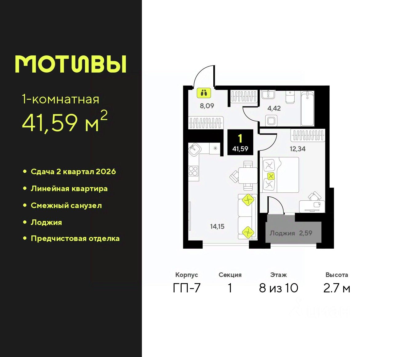 1-комн. квартира от застройщика с предчистовой отделкой в ЖК "Мотивы" на 8 этаже. Общая площадь: 41.59 кв.м., жилая: 12.34 кв.м., площадь просторной кухни-столовой: 14.15 кв.м. Все окна выходят на одну сторону. В квартире одна лоджия, один совмещенный санузел. Высота потолков 2.7 м.