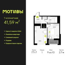 1-комн. квартира от застройщика с предчистовой отделкой в ЖК "Мотивы" на 9 этаже. Общая площадь: 41.59 кв.м., жилая: 12.34 кв.м., площадь просторной кухни-столовой: 14.15 кв.м. Все окна выходят на одну сторону. В квартире одна лоджия, один совмещенный санузел. Высота потолков 2.7 м.