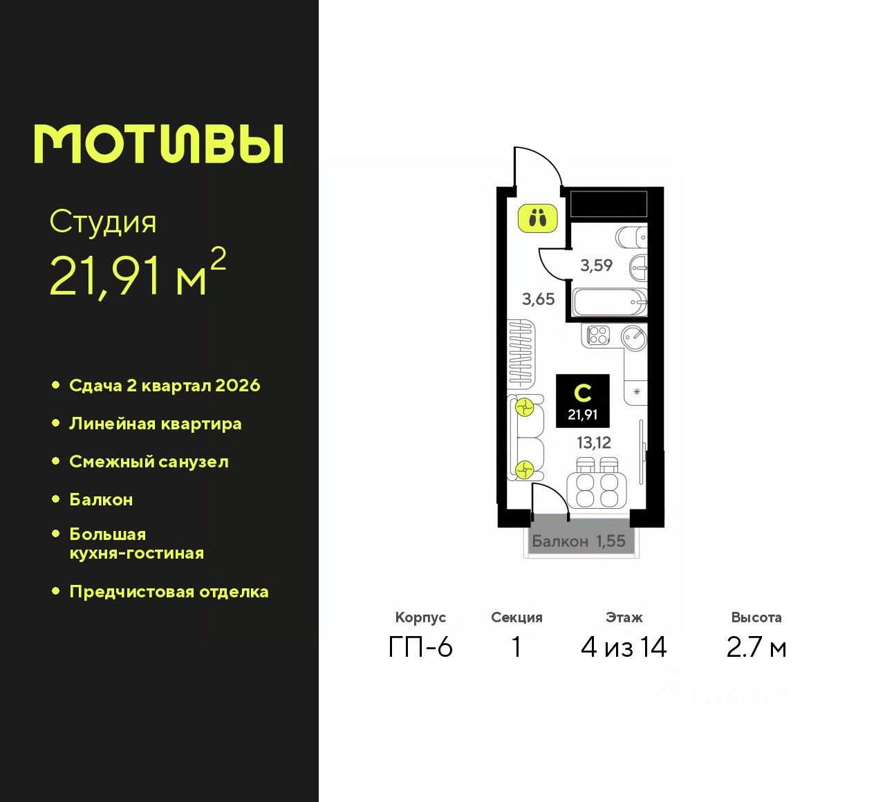 Однокомнатная квартира-студия от застройщика с предчистовой отделкой в ЖК "Мотивы" на 4 этаже. Общая площадь: 21.91 кв.м., площадь гостиной 13.21 кв.м., из которых 5 кв.м. выделено под кухонную зону. Все окна выходят на одну сторону. В квартире один балкон, один совмещенный санузел. Высота потолков 2.7 м.