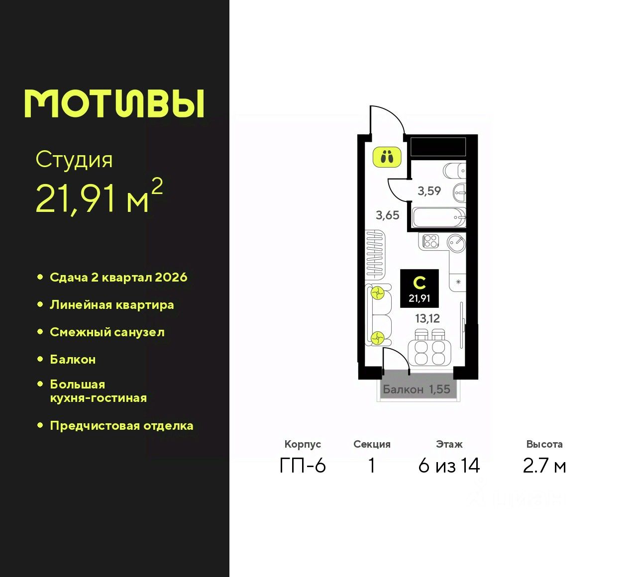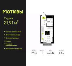 Просторная 1-комн. квартира-студия с предчистовой отделкой в ЖК "Мотивы" на 6 этаже. Общая площадь: 21.91 кв.м., площадь гостиной 13.21 кв.м., из которых 5 кв.м. выделено под кухонную зону. Все окна выходят на одну сторону. В квартире один балкон, один совмещенный санузел. Высота потолков 2.7 м.