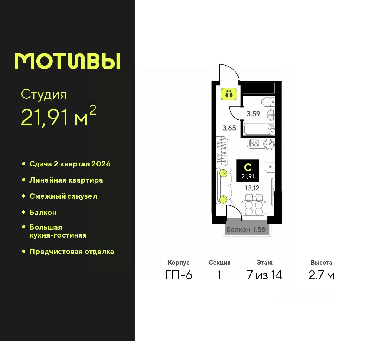 Просторная однокомнатная квартира-студия с предчистовой отделкой в ЖК "Мотивы" на 7 этаже. Общая площадь: 21.91 кв.м., площадь гостиной 13.21 кв.м., из которых 5 кв.м. выделено под кухонную зону. Все окна выходят на одну сторону. В квартире один балкон, один совмещенный санузел. Высота потолков 2.7 м.