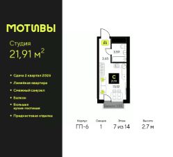 Продается 1-комн. квартира-студия с предчистовой отделкой в ЖК "Мотивы" на 7 этаже. Общая площадь: 21.91 кв.м., площадь гостиной 13.21 кв.м., из которых 5 кв.м. выделено под кухонную зону. Все окна выходят на одну сторону. В квартире один балкон, один совмещенный санузел. Высота потолков 2.7 м.