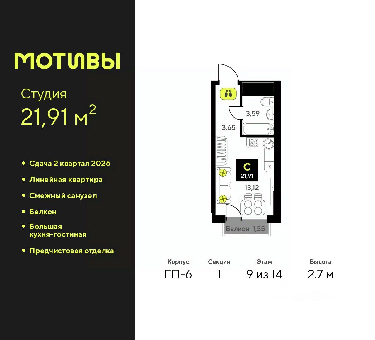 1-комн. квартира-студия от застройщика с предчистовой отделкой в ЖК "Мотивы" на 9 этаже. Общая площадь: 21.91 кв.м., площадь гостиной 13.21 кв.м., из которых 5 кв.м. выделено под кухонную зону. Все окна выходят на одну сторону. В квартире один балкон, один совмещенный санузел. Высота потолков 2.7 м.