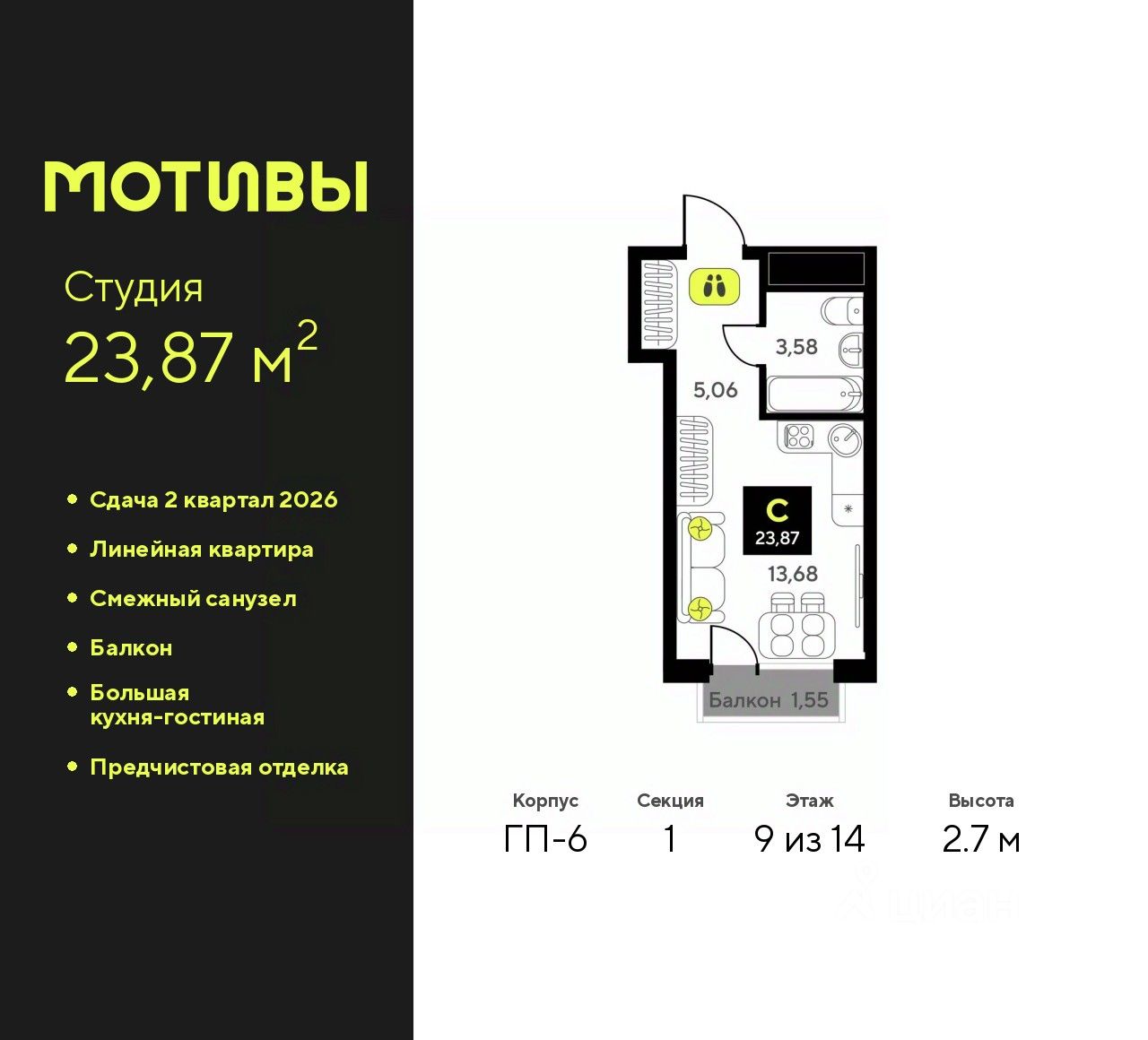 Просторная однокомнатная квартира-студия с предчистовой отделкой в ЖК "Мотивы" на 9 этаже. Общая площадь: 23.87 кв.м., площадь гостиной 13.68 кв.м., из которых 5 кв.м. выделено под кухонную зону. Все окна выходят на одну сторону. В квартире один балкон, один совмещенный санузел. Высота потолков 2.7 м.