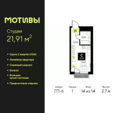 1-комн. квартира-студия от застройщика с предчистовой отделкой в ЖК "Мотивы" на 14 этаже. Общая площадь: 21.91 кв.м., площадь гостиной 13.21 кв.м., из которых 5 кв.м. выделено под кухонную зону. Все окна выходят на одну сторону. В квартире один балкон, один совмещенный санузел. Высота потолков 2.7 м.