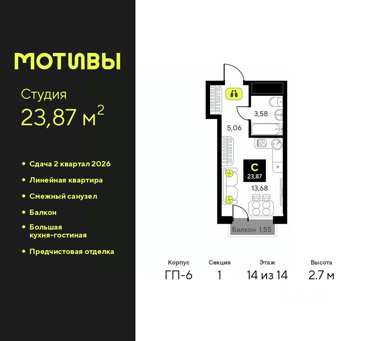 1-комн. квартира-студия с предчистовой отделкой в ЖК "Мотивы" на 14 этаже. Общая площадь: 23.87 кв.м., площадь гостиной 13.68 кв.м., из которых 5 кв.м. выделено под кухонную зону. Все окна выходят на одну сторону. В квартире один балкон, один совмещенный санузел. Высота потолков 2.7 м.