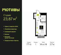 Просторная 1-комн. квартира-студия с предчистовой отделкой в ЖК "Мотивы" на 14 этаже. Общая площадь: 23.87 кв.м., площадь гостиной 13.68 кв.м., из которых 5 кв.м. выделено под кухонную зону. Все окна выходят на одну сторону. В квартире один балкон, один совмещенный санузел. Высота потолков 2.7 м.