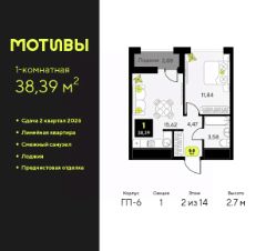 Однокомнатная квартира с предчистовой отделкой в ЖК "Мотивы" на 2 этаже. Общая площадь: 38.39 кв.м., жилая: 11.84 кв.м., площадь просторной кухни-столовой: 15.62 кв.м. Все окна выходят на одну сторону. В квартире одна лоджия, один совмещенный санузел. Высота потолков 2.7 м.