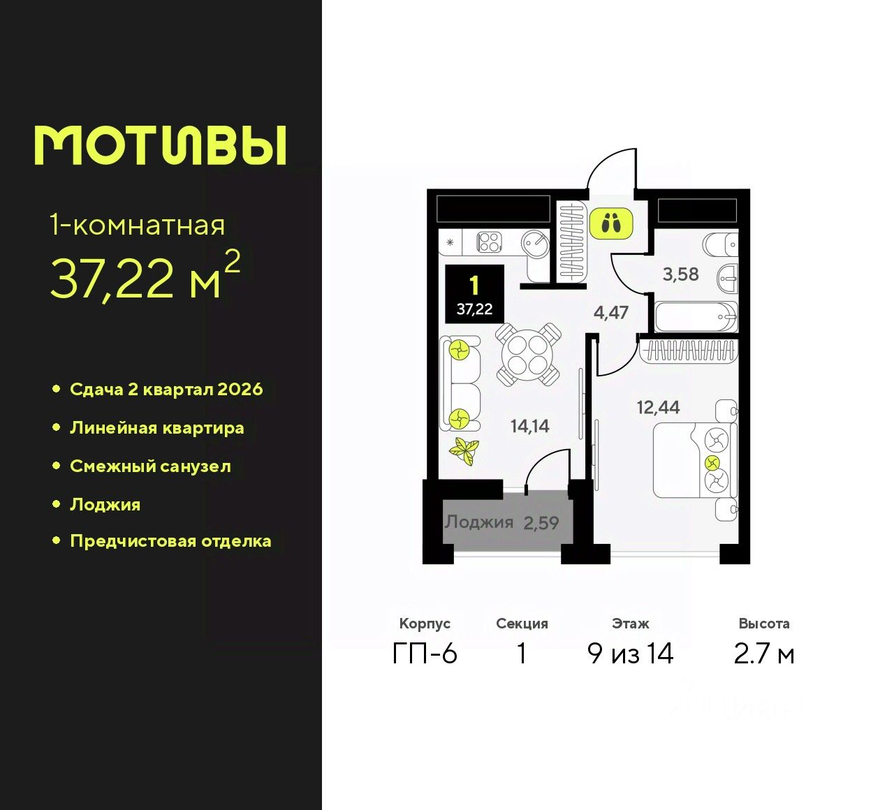 1-комн. квартира с предчистовой отделкой в ЖК "Мотивы" на 9 этаже. Общая площадь: 37.22 кв.м., жилая: 12.44 кв.м., площадь просторной кухни-столовой: 14.14 кв.м. Все окна выходят на одну сторону. В квартире одна лоджия, один совмещенный санузел. Высота потолков 2.7 м.