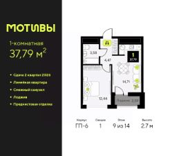 Однокомнатная квартира с предчистовой отделкой в ЖК "Мотивы" на 9 этаже. Общая площадь: 37.79 кв.м., жилая: 12.44 кв.м., площадь просторной кухни-столовой: 14.71 кв.м. Все окна выходят на одну сторону. В квартире одна лоджия, один совмещенный санузел. Высота потолков 2.7 м.