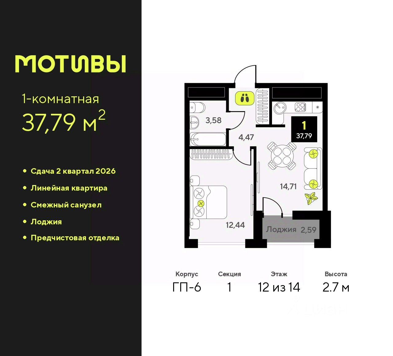 Продается однокомнатная квартира с предчистовой отделкой в ЖК "Мотивы" на 12 этаже. Общая площадь: 37.79 кв.м., жилая: 12.44 кв.м., площадь просторной кухни-столовой: 14.71 кв.м. Все окна выходят на одну сторону. В квартире одна лоджия, один совмещенный санузел. Высота потолков 2.7 м.