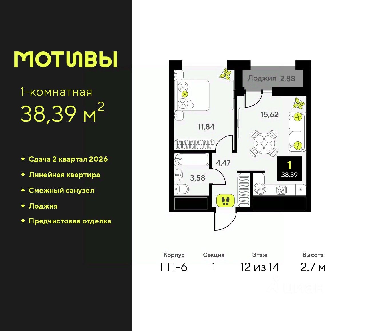 1-комн. квартира от застройщика с предчистовой отделкой в ЖК "Мотивы" на 12 этаже. Общая площадь: 38.39 кв.м., жилая: 11.84 кв.м., площадь просторной кухни-столовой: 15.62 кв.м. Все окна выходят на одну сторону. В квартире одна лоджия, один совмещенный санузел. Высота потолков 2.7 м.