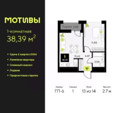 Продается однокомнатная квартира с предчистовой отделкой в ЖК "Мотивы" на 13 этаже. Общая площадь: 38.39 кв.м., жилая: 11.84 кв.м., площадь просторной кухни-столовой: 15.62 кв.м. Все окна выходят на одну сторону. В квартире одна лоджия, один совмещенный санузел. Высота потолков 2.7 м.