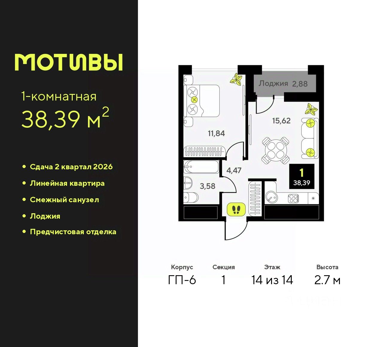 1-комн. квартира от застройщика с предчистовой отделкой в ЖК "Мотивы" на 14 этаже. Общая площадь: 38.39 кв.м., жилая: 11.84 кв.м., площадь просторной кухни-столовой: 15.62 кв.м. Все окна выходят на одну сторону. В квартире одна лоджия, один совмещенный санузел. Высота потолков 2.7 м.