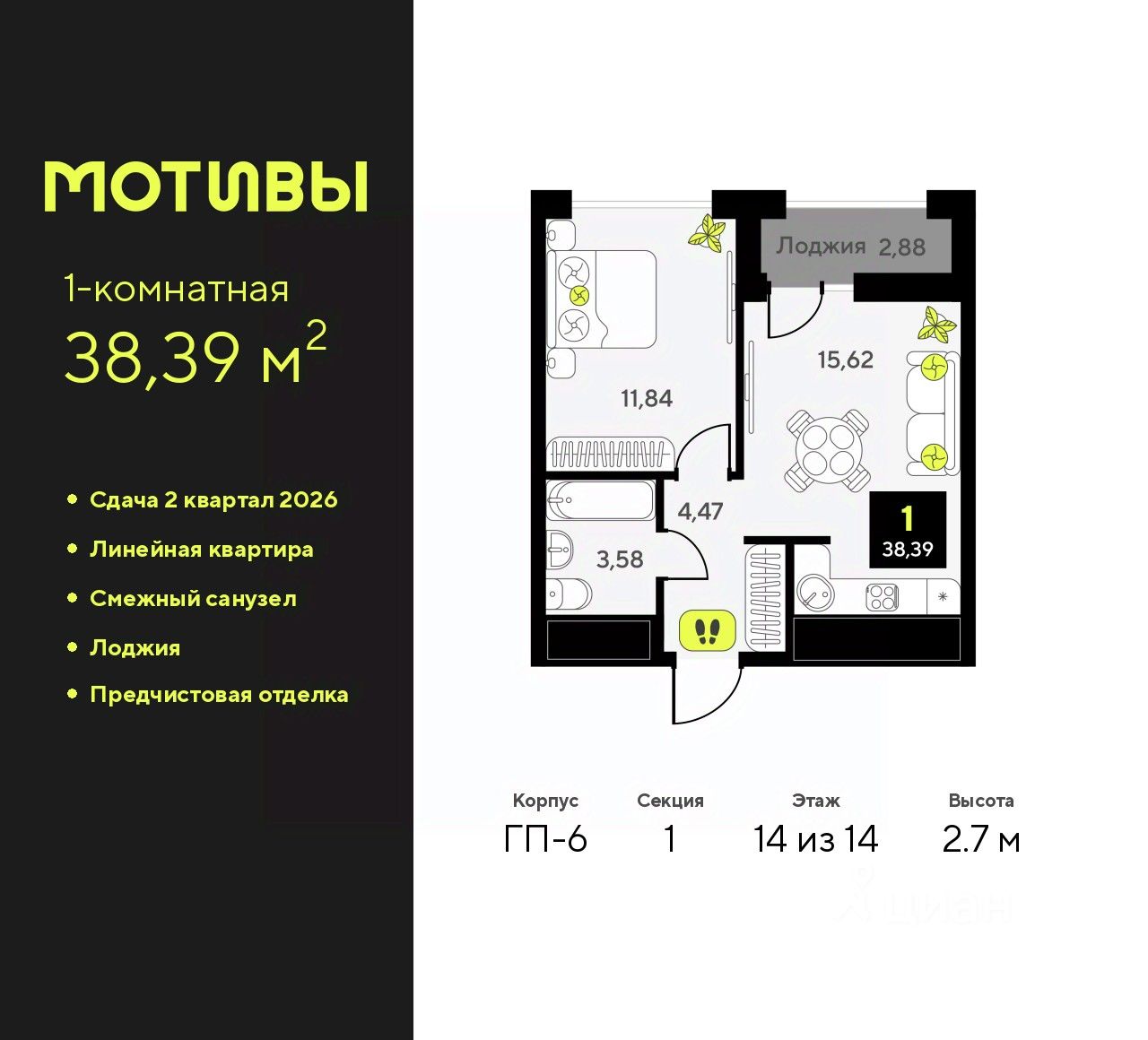 Продается однокомнатная квартира с предчистовой отделкой в ЖК "Мотивы" на 14 этаже. Общая площадь: 38.39 кв.м., жилая: 11.84 кв.м., площадь просторной кухни-столовой: 15.62 кв.м. Все окна выходят на одну сторону. В квартире одна лоджия, один совмещенный санузел. Высота потолков 2.7 м.