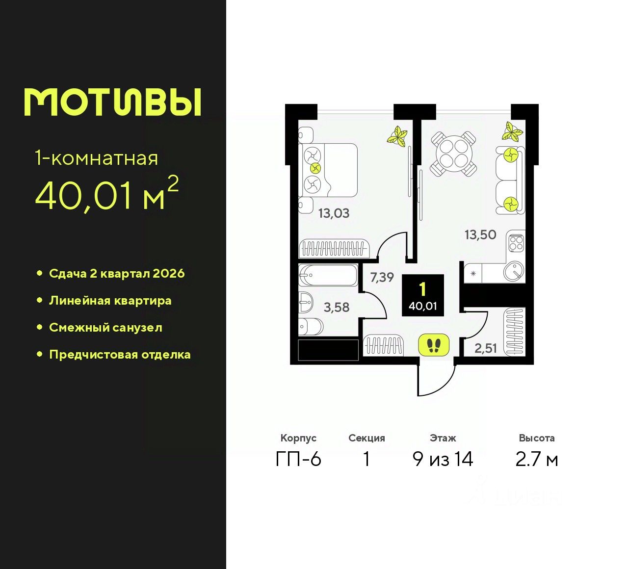 Продается 1-комн. квартира от застройщика с предчистовой отделкой в ЖК "Мотивы" на 9 этаже. Общая площадь: 40.01 кв.м., жилая: 13.03 кв.м., площадь просторной кухни-столовой: 13.5 кв.м. Все окна выходят на одну сторону. В квартире один совмещенный санузел. Высота потолков 2.7 м.