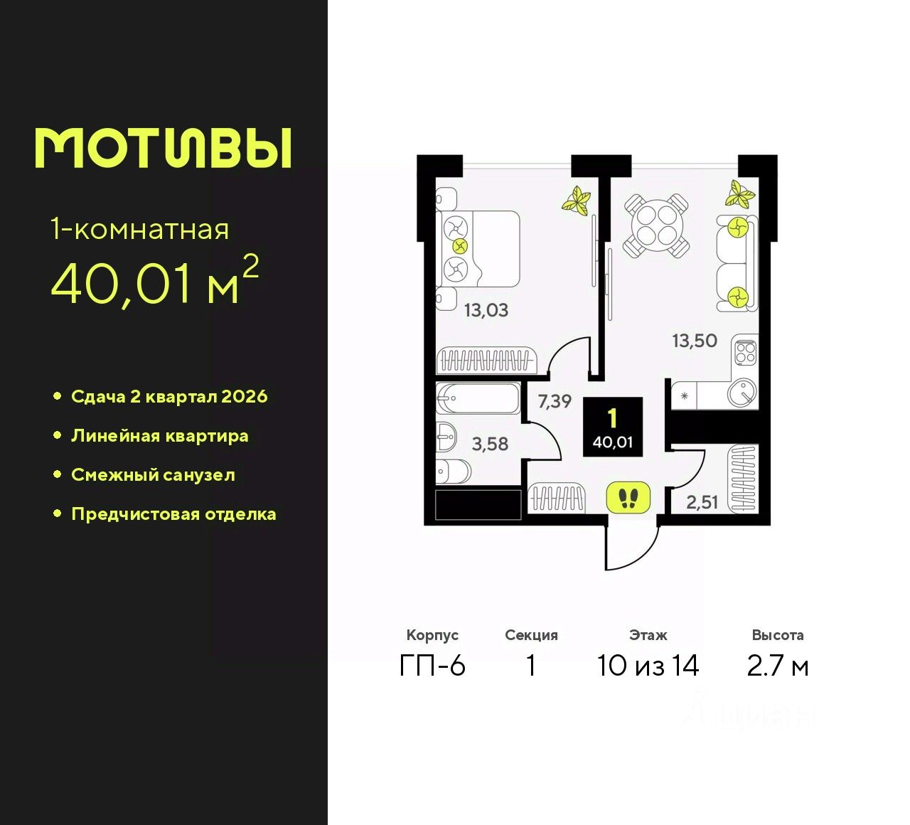 Продается однокомнатная квартира с предчистовой отделкой в ЖК "Мотивы" на 10 этаже. Общая площадь: 40.01 кв.м., жилая: 13.03 кв.м., площадь просторной кухни-столовой: 13.5 кв.м. Все окна выходят на одну сторону. В квартире один совмещенный санузел. Высота потолков 2.7 м.