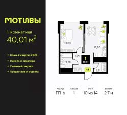 Однокомнатная квартира с предчистовой отделкой в ЖК "Мотивы" на 10 этаже. Общая площадь: 40.01 кв.м., жилая: 13.03 кв.м., площадь просторной кухни-столовой: 13.5 кв.м. Все окна выходят на одну сторону. В квартире один совмещенный санузел. Высота потолков 2.7 м.