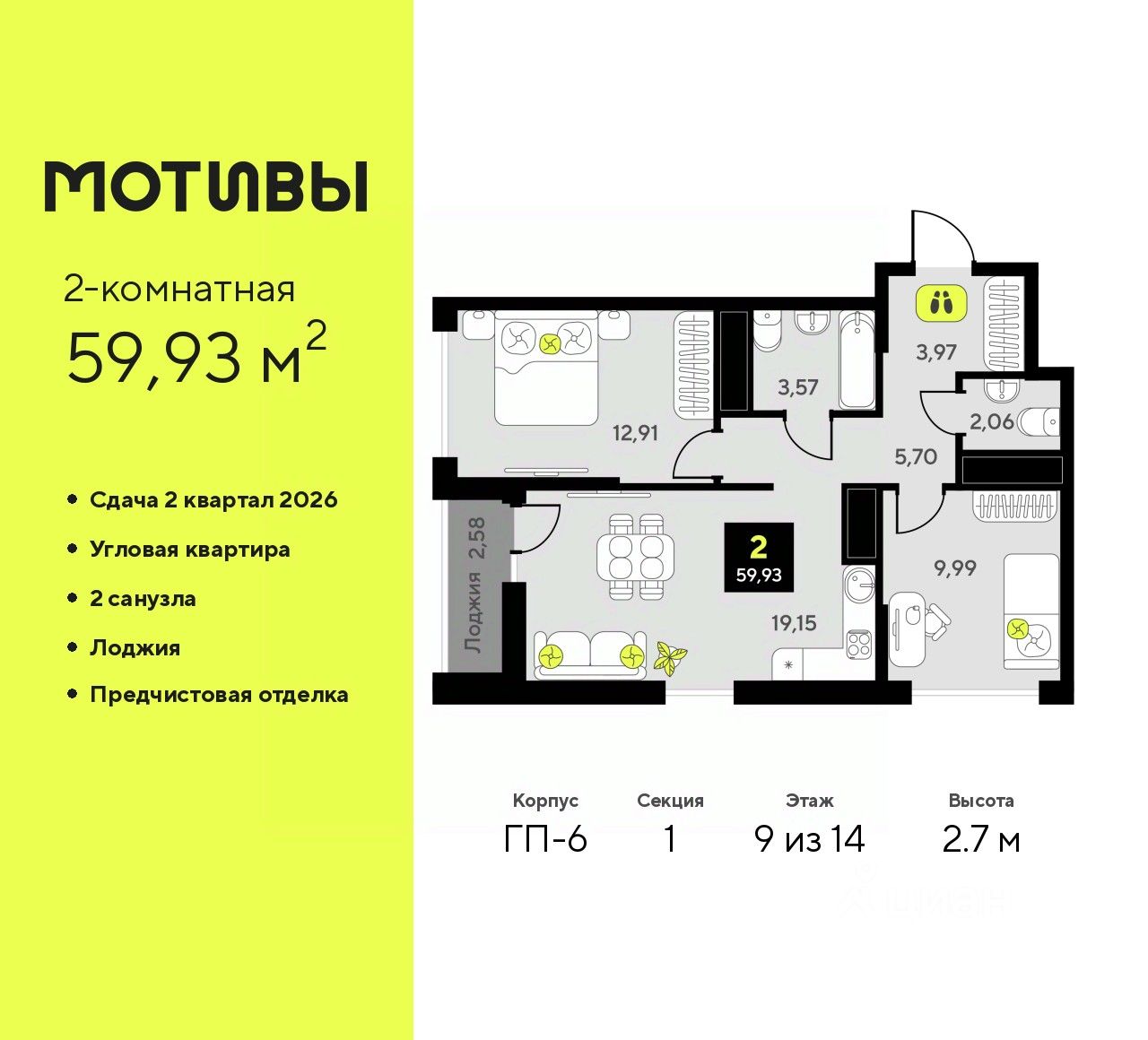Продается двухкомнатная квартира от застройщика с предчистовой отделкой в ЖК "Мотивы" на 9 этаже. Общая площадь: 59.93 кв.м., жилая: 22.9 кв.м., площадь просторной кухни-столовой: 19.15 кв.м. Угловая квартира, идеально подойдет любителям тишины и панорамных видов. В квартире одна лоджия, один совмещенный и один раздельный санузел. Высота потолков 2.7 м.