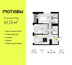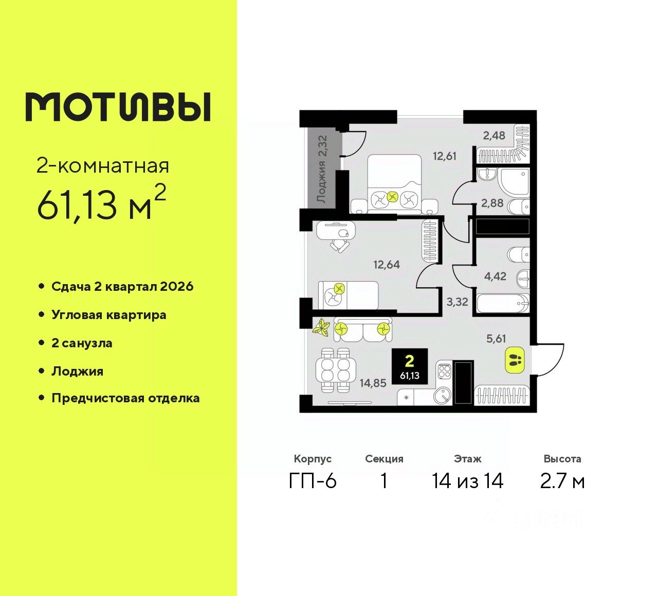 2-комн. квартира от застройщика с предчистовой отделкой в ЖК "Мотивы" на 14 этаже. Общая площадь: 61.13 кв.м., жилая: 25.25 кв.м., площадь просторной кухни-столовой: 14.85 кв.м. Угловая квартира, очень светлая, естественная вентиляция при открытии окон. В квартире одна лоджия, два совмещенных санузла. Высота потолков 2.7 м.
