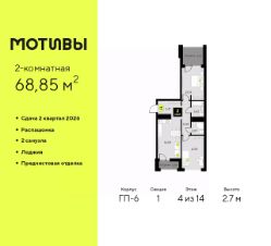 2-комн. квартира с предчистовой отделкой в ЖК "Мотивы" на 4 этаже. Общая площадь: 68.85 кв.м., жилая: 25.71 кв.м., площадь просторной кухни-столовой: 16.05 кв.м. Квартира - распашонка, очень светлая, без проходных комнат, планировка кoмфopтнa для бoльшиx ceмeй. В квартире две лоджии, два совмещенных санузла. Высота потолков 2.7 м.