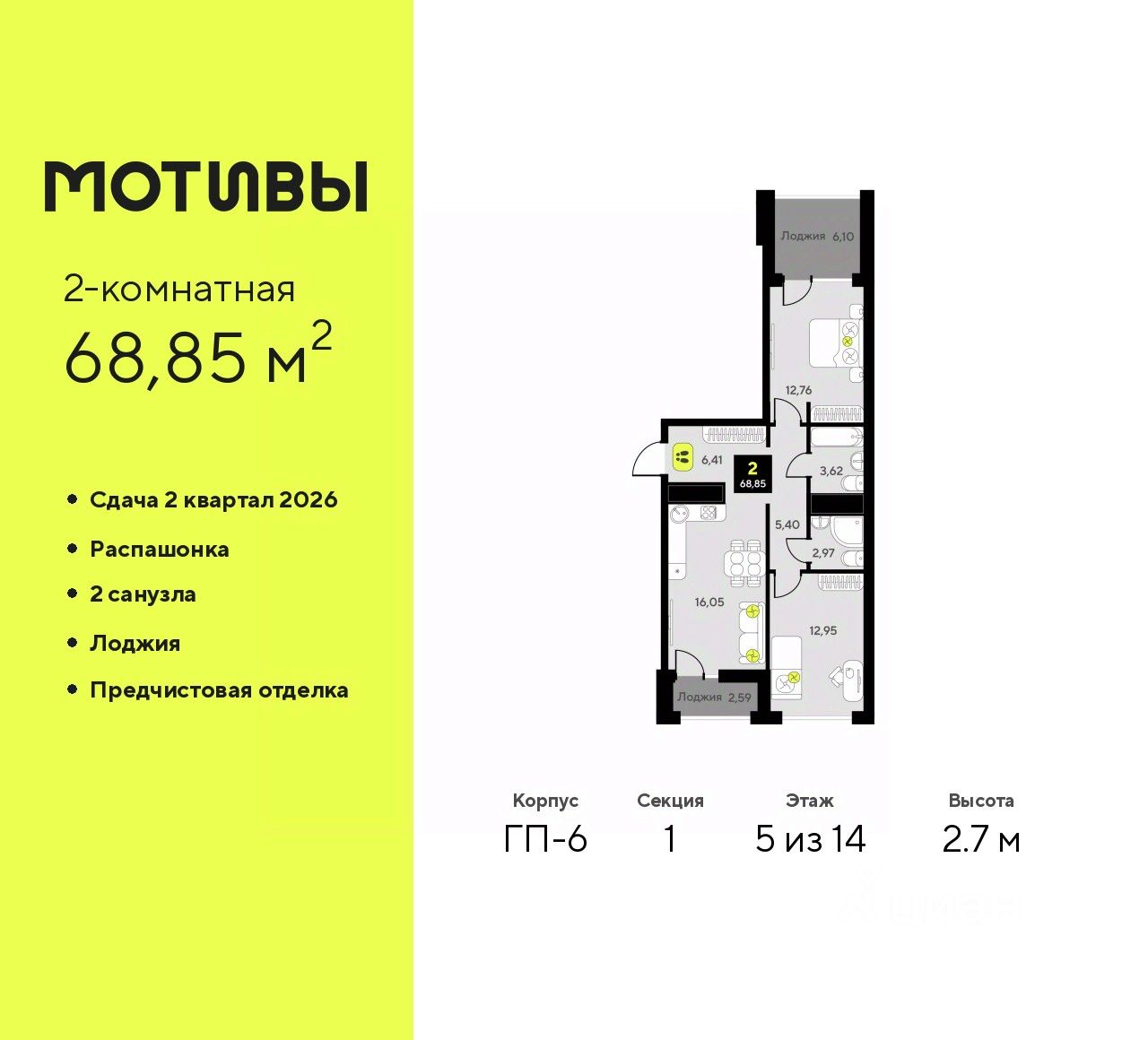 Просторная двухкомнатная квартира с предчистовой отделкой в ЖК "Мотивы" на 5 этаже. Общая площадь: 68.85 кв.м., жилая: 25.71 кв.м., площадь просторной кухни-столовой: 16.05 кв.м. Квартира - распашонка, без проходных комнат, окна выходят на paзные стороны дома. В квартире две лоджии, два совмещенных санузла. Высота потолков 2.7 м.