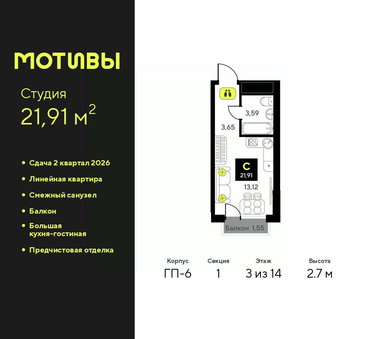 Просторная 1-комн. квартира-студия с предчистовой отделкой в ЖК "Мотивы" на 3 этаже. Общая площадь: 21.91 кв.м., площадь гостиной 13.21 кв.м., из которых 5 кв.м. выделено под кухонную зону. Все окна выходят на одну сторону. В квартире один балкон, один совмещенный санузел. Высота потолков 2.7 м.