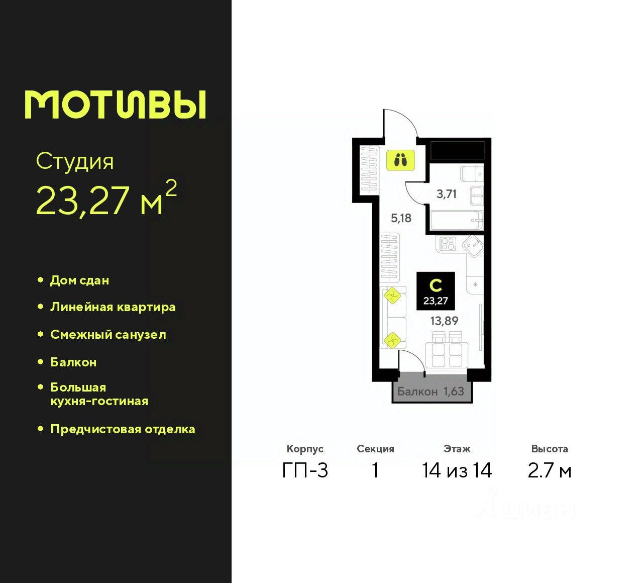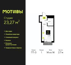 1-комн. квартира-студия с предчистовой отделкой в ЖК "Мотивы" на 14 этаже. Общая площадь: 23.27 кв.м., площадь гостиной 13.89 кв.м., из которых 5 кв.м. выделено под кухонную зону. Все окна выходят на одну сторону. В квартире один балкон, один совмещенный санузел. Высота потолков 2.7 м.