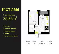 Однокомнатная квартира с предчистовой отделкой в ЖК "Мотивы" на 14 этаже. Общая площадь: 35.85 кв.м., жилая: 12.01 кв.м., площадь просторной кухни-столовой: 14.36 кв.м. Все окна выходят на одну сторону. В квартире одна лоджия, один совмещенный санузел. Высота потолков 2.7 м.