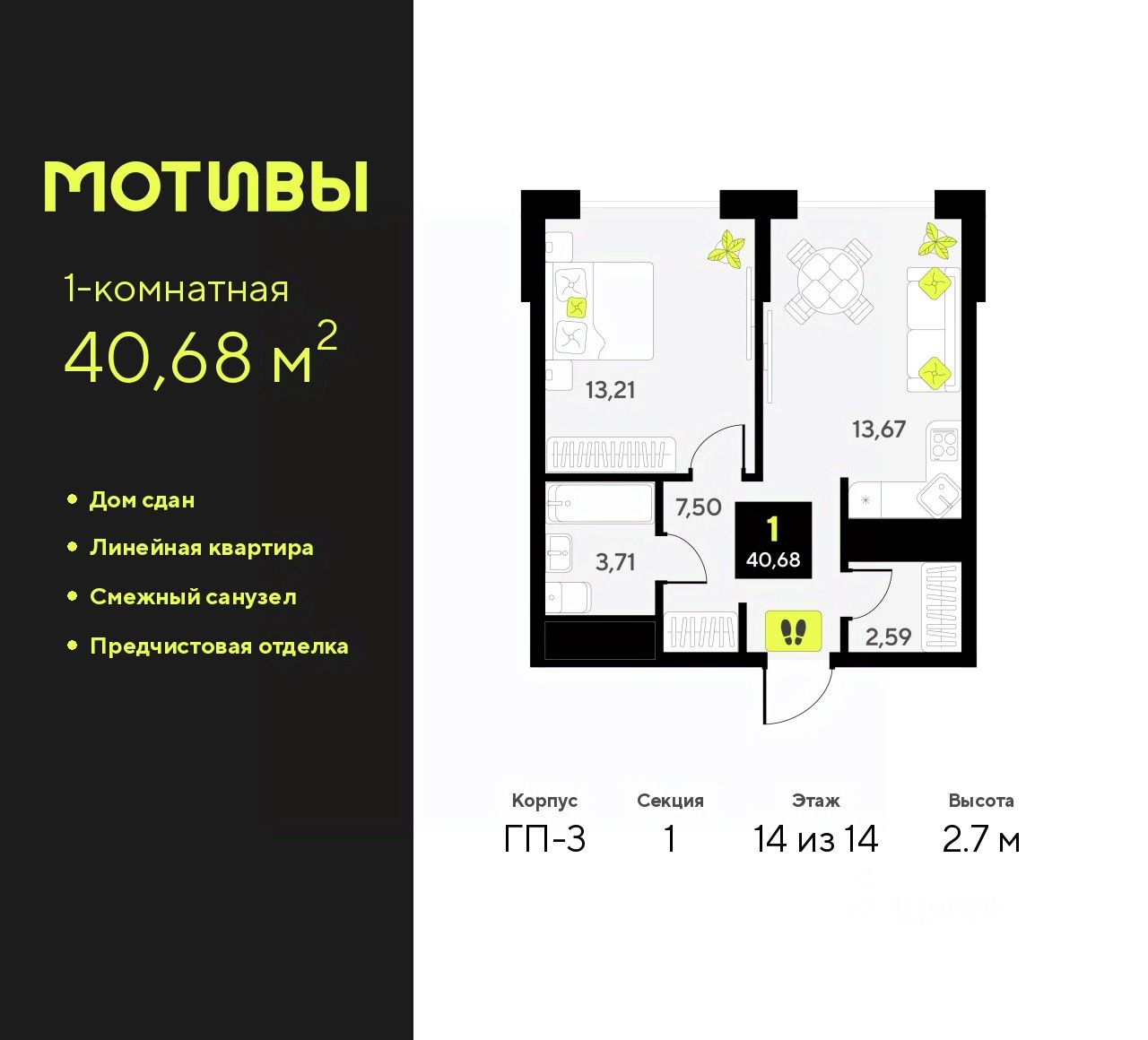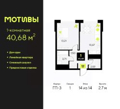 Продается однокомнатная квартира с предчистовой отделкой в ЖК "Мотивы" на 14 этаже. Общая площадь: 40.68 кв.м., жилая: 13.21 кв.м., площадь просторной кухни-столовой: 13.67 кв.м. Все окна выходят на одну сторону. В квартире один совмещенный санузел. Высота потолков 2.7 м.