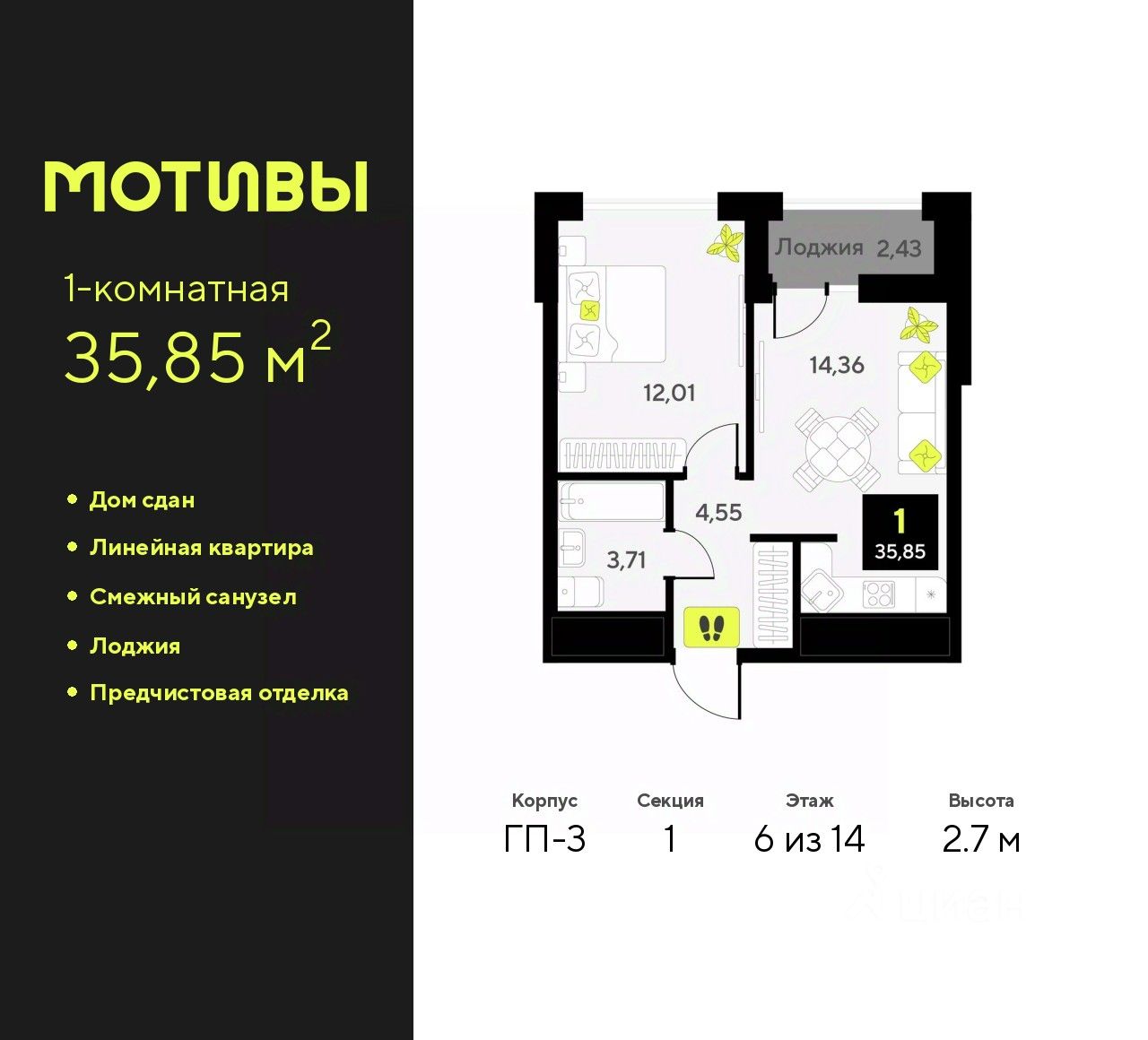 Продается 1-комн. квартира от застройщика с предчистовой отделкой в ЖК "Мотивы" на 6 этаже. Общая площадь: 35.85 кв.м., жилая: 12.01 кв.м., площадь просторной кухни-столовой: 14.36 кв.м. Все окна выходят на одну сторону. В квартире одна лоджия, один совмещенный санузел. Высота потолков 2.7 м.